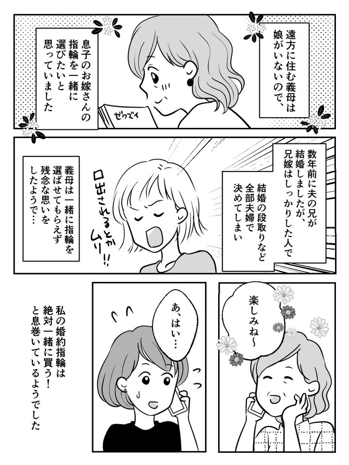 いろいろなお店を見て回りたかったのですが、義母は、すでにブランドもデザインも決めている様子です。また、クミさんは普段使いしやすい指輪を希望していましたが、すすめられたのは立て爪の豪華なデザインのもの。彼は義母に同調するだけで、フォローはありません。