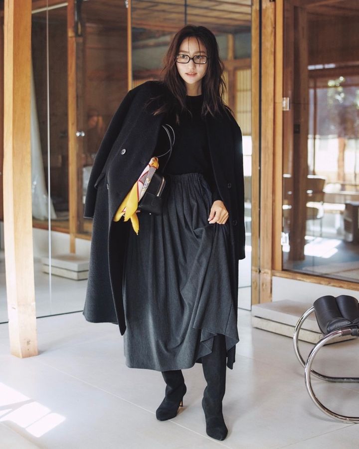 コート¥29,900スカート¥5,990(ともにムジラボ/無印良品代官山)中に着たニット¥9,990(ユニクロ)メガネ¥52,580(ミュウミュウ/ルックスオティカジャパン カスタマーサービス)バッグ¥86,900(メゾン カナウ/ヤマニ)バッグに巻いたスカーフ¥15,400(ザシンゾーン/シンゾーン ルミネ有楽町店)ブーツ¥121,000(ダブルスタンダードクロージング/フィルム)