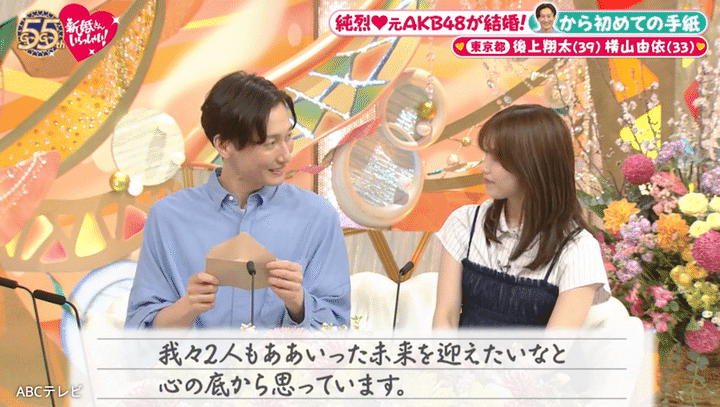 最後に「ちゃんとしたプロポーズをしていない」という後上から、横山由依への初めての手紙を披露。純烈のコンサート会場で、結婚生活が長そうなベテランご夫婦にお会いするたび、そのステキな姿にふたりの未来を重ねるそうだ。