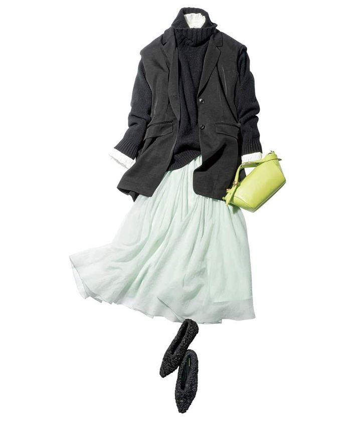 ジレ¥55,000(THIRD MAGAZINE)タートルニット¥39,600(スローン/ザ ショップ スローン 新静岡セノバ店)フリルシャツ¥17,600(HeRIN.CYE)フレアスカート¥37,400(ANAYI)バッグ¥44,000(トフ&ロードストーン)ボアパンプス¥24,200(オゥ バニスター/アバハウスインターナショナル オンラインストア)