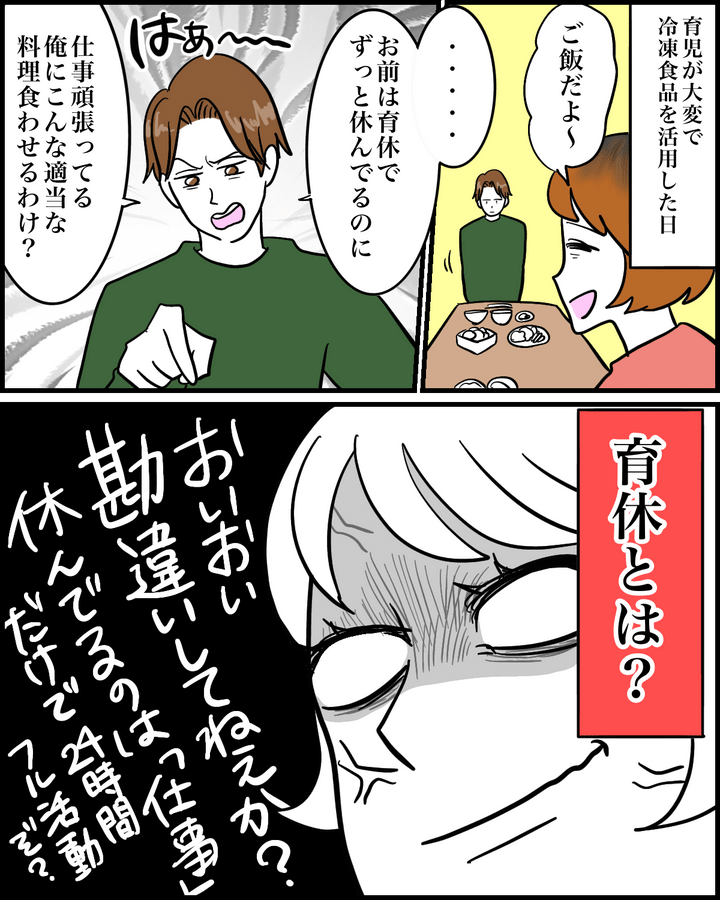 さてここで問題です。「育休」とは。はて? 超絶勘違い夫の家事ネガ言葉にはビックリです。育休って仕事を休んでいるだけであって、子育ては24時間待ったなし。休めるものなら休みたいわー! あと、冷凍食品だって立派な料理ですから。なめるなよぉ!