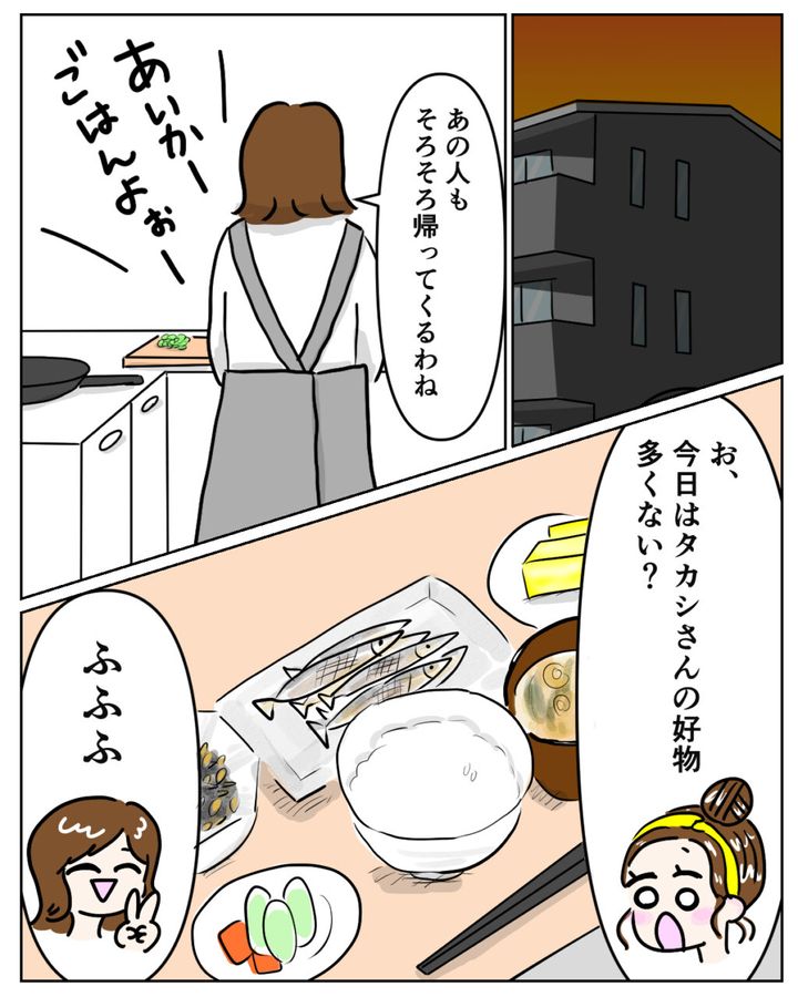 夕食ができあがるころに彼も帰ってきます。「おっ。今日はタカシさんの好物が多くない?」と愛花に指摘されます。そしてこのたわいもない日常に幸せを感じてしまいます。