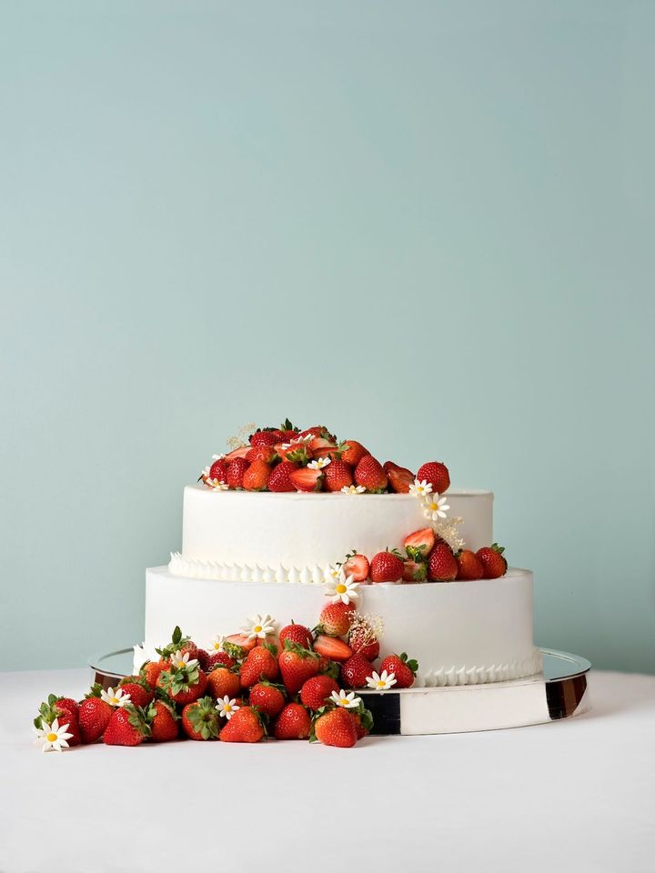 シンプルな2段のケーキに、こぼれるようにイチゴをあしらったデザイン。シュガークラフトで作ったマーガレットのような小花を添えると可愛さもアップ!