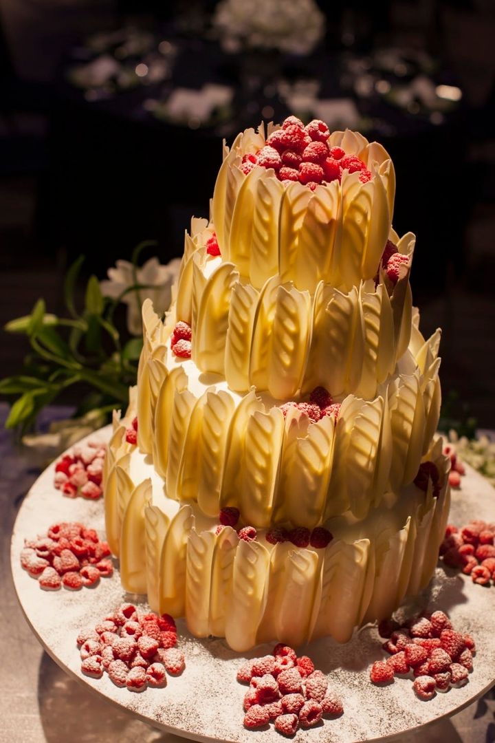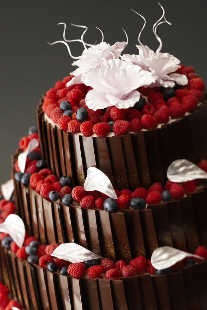 パティシエの技が光る見事なチョコレート細工のウエディング・ケーキ。透明感のある装飾に、ところどころ見え隠れする真っ赤なラズベリーが華やかなアクセントに。