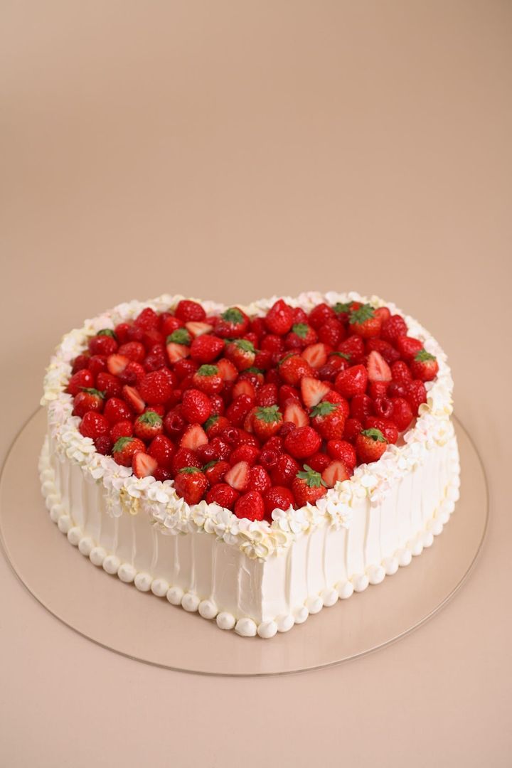 真っ赤なベリーはハートのデザインにぴったりのフルーツ。ケーキのふちを小花の飾りでトリミングすればウエディングらしいスペシャル感がアップ!