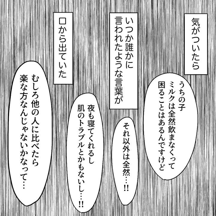 医師から、子育てで強いストレスを感じたなど、痛みの原因になるような心当たりはないか問われたまろ。しかしなぜかこのとき思い出したのは友人が放った「メメちゃんはすごく育てやすい子だと思うよ」の言葉で…。まろは心当たりは「ありません」と答え、さらにいつか誰かに言われたような言葉が口から勝手に出てきて、これまで苦しんできたことを言えませんでした。