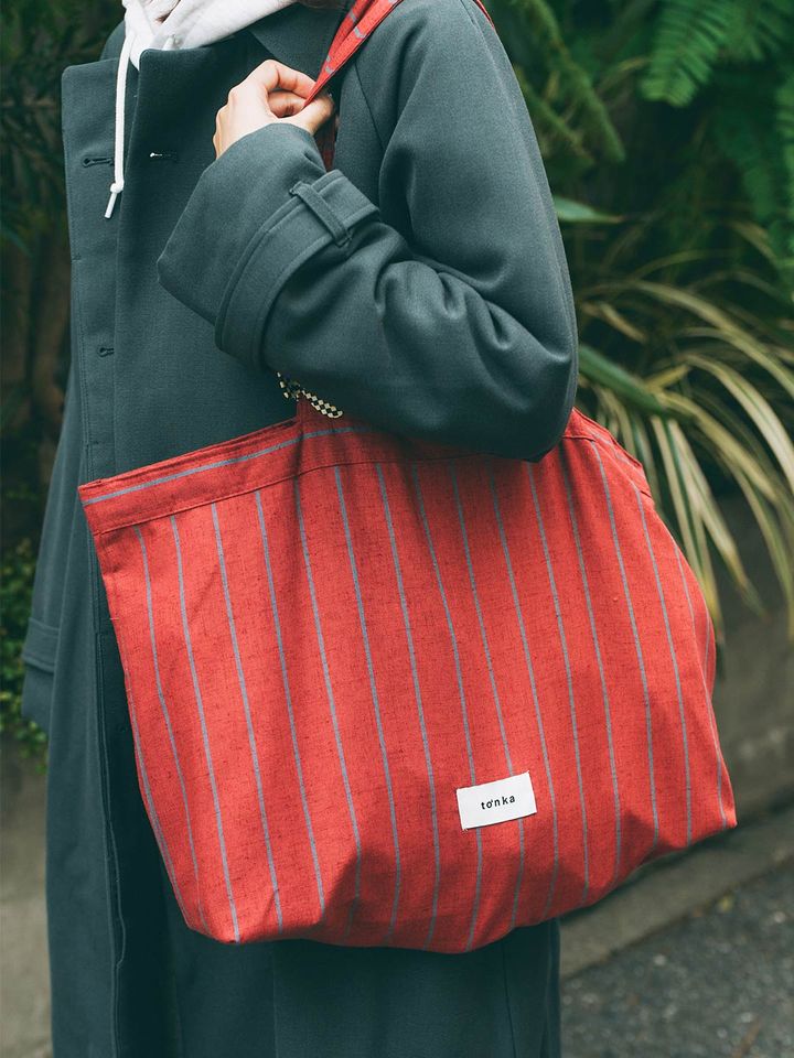 『トンカ』のレッドストライプバッグが、冬コーデに鮮やかな挿し色をオン。子どもとのお出かけにぴったりな大容量サイズも頼もしい!