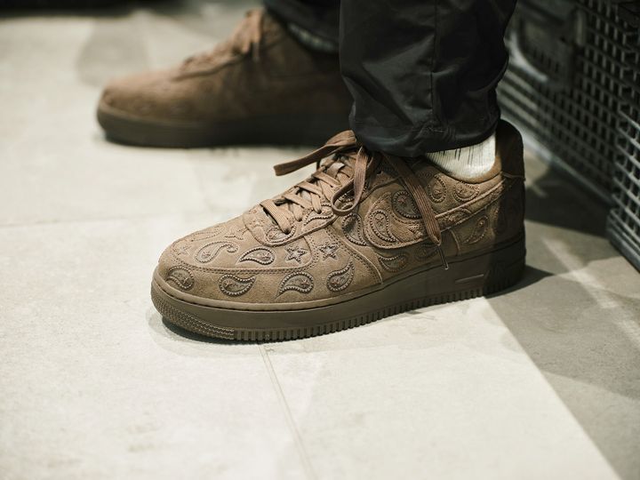 三田「僕は扁平足で甲も高いので、ゆとりのある〈ナイキ〉の《エアフォースワン》が合っていて、昔からよく履いています。今日のモデルはペイズリー柄に一目惚れ。最近は茶色にハマりすぎて、その色ばかり見てしまいます」