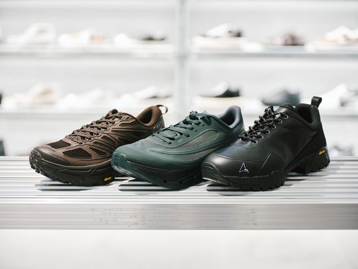 右/ROAの《NEAL》。51,700円。サイズ展開はメンズ。「ロケ履き(ロケ撮影用のシューズ)を何にするかって選ぶのが好きで、そういうときに適正なのが、コンクリートの路面以外の悪路でも活躍するアウトドア由来のもの。以前から、カナダのモントリオールで誕生したスニーカーブランド〈norda(ノルダ)〉は気になっていて、おそらくHerringbone Footwearの品揃えは都内随一。見た目以上に軽くて、ケアも手軽そう」中/ONの《CLOUDFLOW 5 AD》。28,600円。サイズ展開はメンズ・レディース。「ONの《CLOUDFLOW 5 AD》は、レーシングシューズのアッパーでありながら、ライフスタイルのカテゴリーから登場しモデルなので、しっかりと走れて、日常でも履ける。異なる2つのシーンをシームレスに繋げるところがいい」左/HOKAの《MAFATE SPEED 2 TS》"Available limitedly at mita sneakers / Herringbone Footwear / HOKA official store" 24,200円 。サイズ展開はメンズ。「僕もホカを1足選びました。ホカで最も好きなシリーズが、この“マファテ”です。オンと同じく、ランも日常も活躍する一足。限られた店舗でしかブラウンは販売されていないそうなので、周りと被らなそうなのも自分好み」