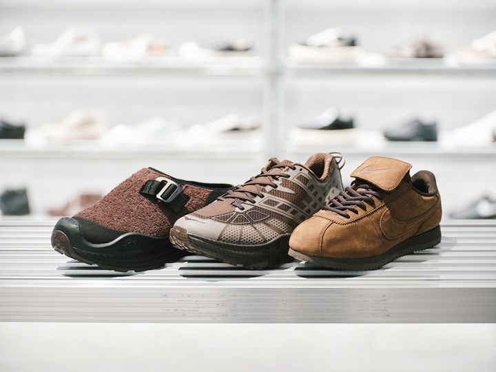 右/ナイキの《CORTEZ LTR SE》。14,300円。サイズ展開はメンズ・レディース。「取り外しできるシュータンは付けたまま履きたい。その方が足元に視線がいき、可愛いですよね。ユニセックスなデザインで、幅広いサイズ展開があるので、女性にもおすすめ」中/HOKAの《SPEEDGOAT 2 TS 》"Available limitedly at mita sneakers / Herringbone Footwear / HOKA official store"。27,500円。サイズ展開はメンズ。「愛用しているホカは、サンダルとハイカットモデルばかりなので、ローカットを試してみたい。色は、やはりブラウンが気になります。リフレクター部分の配色まで、ブラウンに染まっているデザインも面白いなと思いました」左/HOKAの《U ORA PRIMO EXT》。20,900円。サイズ展開はメンズ。「すでに同じモデルの黒を愛用しているので、ブラウンも買い足したい。履き心地を重視するなら断然ジャストサイズ。かかと部分がピタッと収まるように、合わせるソックスの厚さを想定してサイズを選んでいます。秋冬は、春夏用よりもワインサイズアップさせて履いています」