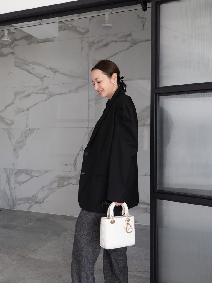 バッグは、ホワイトのレディディオールをセレクト。モノトーンを基調にしたスタイリングに、クリーンな明るさとエレガンスを添えてくれます。まとめた髪にはリボンのヘアアクセサリーをさりげなくON。