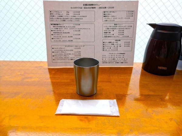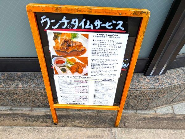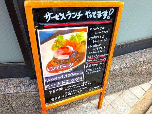 メニューには、若鶏の唐揚げなど、うどん屋さん時代の人気メニューもありました。看板にあった、ポーチドエッグ付きのハンバーグもおいしそうですね。