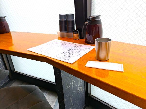 天井の高い開放的な店内は、和と洋をミックスしたモダンな雰囲気で、大きな木のカウンター席と窓側の席があります。