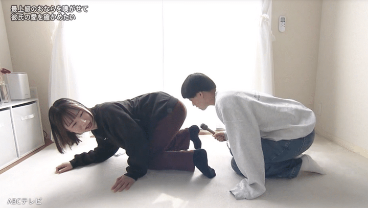 返事は「くさいから」という拍子抜けするものだった。依頼者の強い想いを初めて知った彼氏は、これからもおなら(=愛情)を受け止めることを約束。さすがに「今から」という要望には「どういうこと?」と躊躇したが、「顔つけて!」「鼻つけて!」という指示に「はい!」「つけたよ」ととっても従順。プウ〜と放たれたおならに、彼氏が「くっさ!」と鼻を摘んでいる。タンパク質効果、絶大だ。