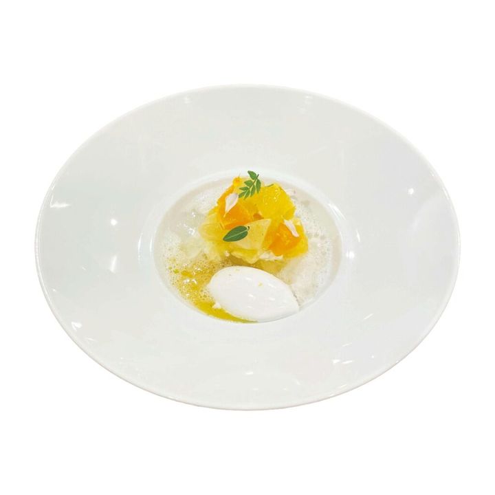 フレンチの料理人である店主の松本泰さんが作るのは、注文後にカウンターで仕上げる華やかなデザート。旬の果物やハーブを使い、味と香りに立体感を与える。シグネチャーは白檀や檜など、日本人に馴染みの深い木の香りを纏わせたアイスクリーム。この日はクレームダンジュに日向夏や有田みかん、果皮まで使った八朔のピュレ、黒文字のジンのグラニテなどを白檀のアイスに重ねた。ひと口ごとに表情が変わり、果物の力を引き出す一皿だ。3000円。