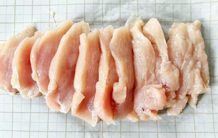 鶏むね肉は、食べやすいよう1cmくらいの厚さでそぎ切りにします。