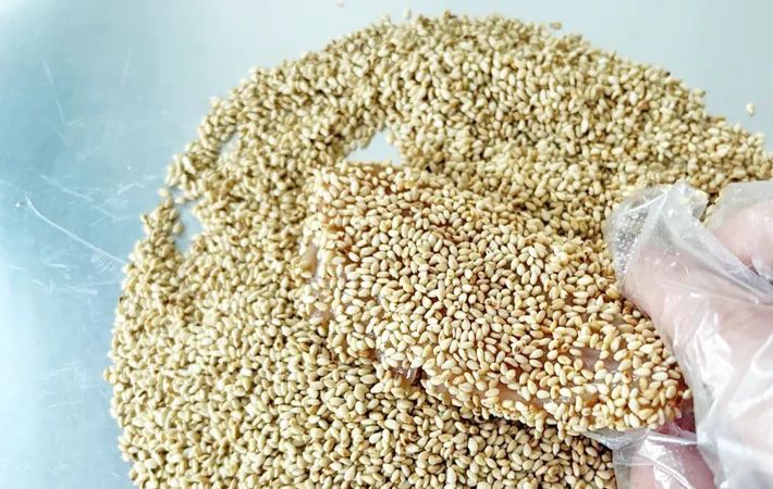 鶏むね肉にしっかりと味がなじんだら、トレーや深めの皿にゴマを入れ、鶏むね肉にまぶしていきましょう。