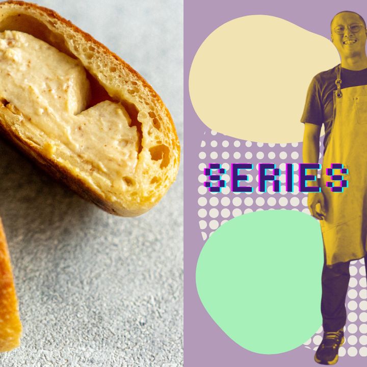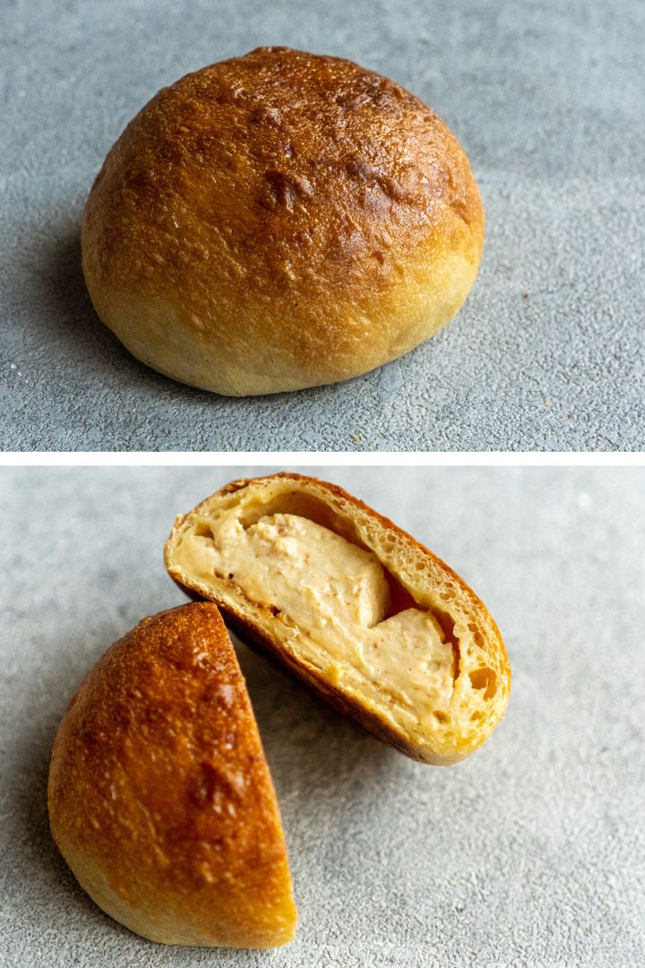 「ヤマザキの『薄皮クリームパン』を本気で作ろうと思ったんです。中がとろっとして薄皮でふわっ、ずっとやわらかい。菓子パン生地で作るとボリュームが出すぎて、薄皮にならない。ブリオッシュ生地でやったら近くなるけど、生地はぱさぱさ。ブリオッシュは総量の40~50%ぐらいバターが入ってる。なんでこんなにぱさぱさになるなのかな? って考えて、バターを眺めてたら、『バターって固まってるな』と気づいたんです。もしかしたら、パンの中でも冷えたら固まってるんじゃないかと思って」