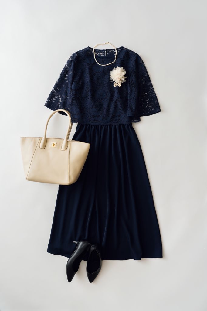 レース素材のトップスがセットになったワンピース。コサージュとパールのブローチを重ねづけすることで、顔まわりが明るくなります。
