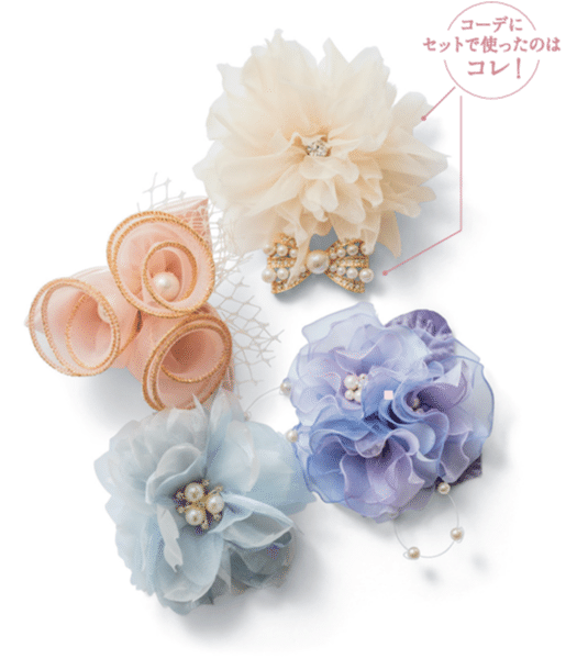 柔らか素材のコサージュで華やかさをアップさせて。ベージュやグレーを選べば大人っぽく仕上がります。