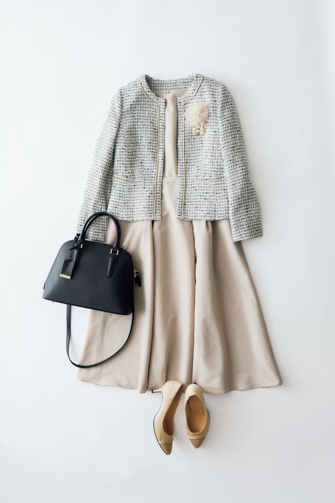 卒業・卒園シーズンのセレモニーコーデ。スカート派のスイートな装いには、ふんわり素材のコサージュでやさしく華やかに。