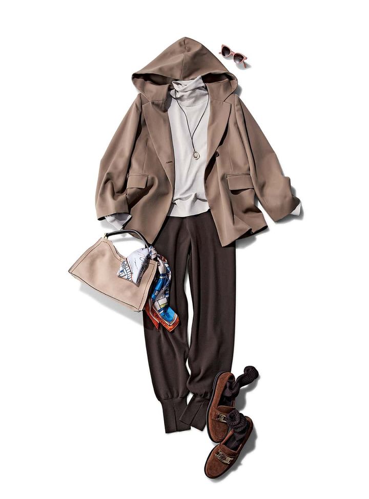 フーディージャケット¥63,800(サードマガジン)タートルネックニット¥31,900(ebure)ニットパンツ¥25,300(ル フィル/ル フィル ニュウマン新宿店)バッグ¥82,500(ジャンニ キアリーニ/ジャンニ キアリーニ 銀座店)バッグにつけたスカーフ〈別注〉¥22,000(MANIPURI/TOMORROWLAND)サングラス¥48,400(プロポ/プロポデザイン)リブソックス¥1,100(靴下屋/タビオ)ローファー¥27,500(オデット エ オディール/オデット エ オディール 新宿店)ネックレス¥7,920(アンタイトル)