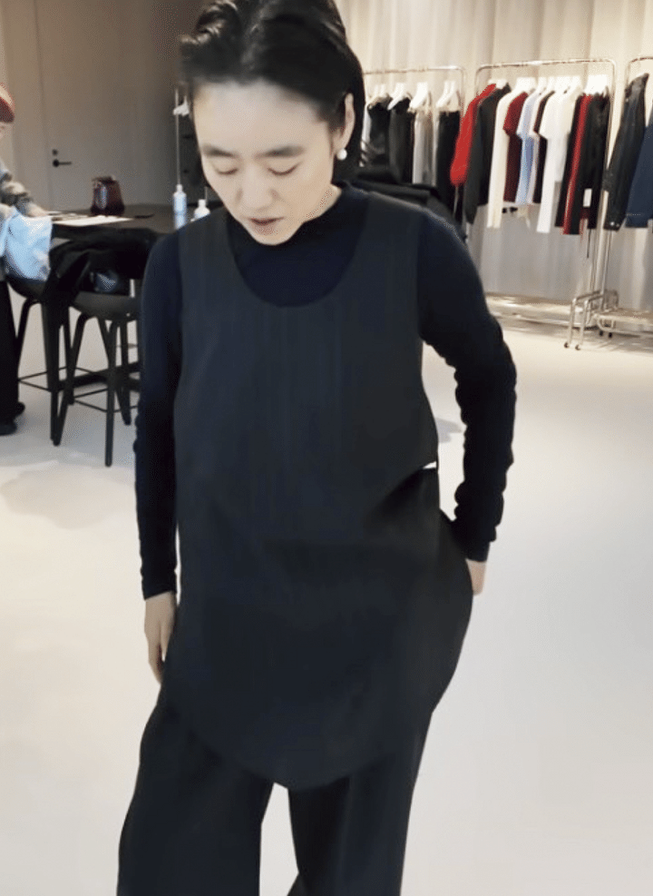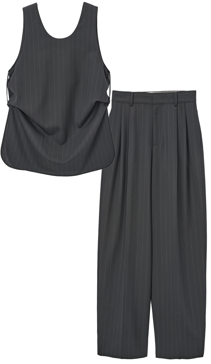 「トップスはサイドボタンでドレープやシルエットを変えられるデザイン。まずはセットアップでキレイめに着て、カジュアルにまとめたいときはレギンスなど合わせてもおしゃれ」