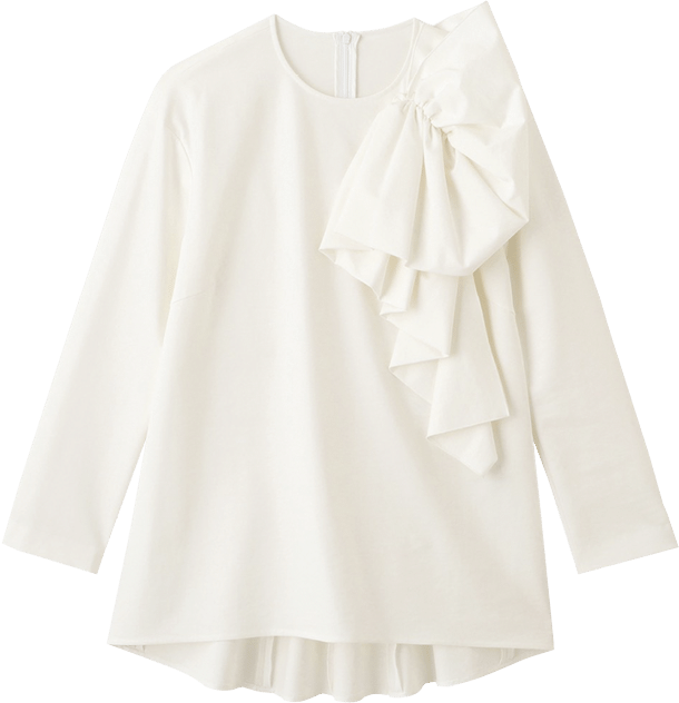 「まるでコサージュのようなフリルが付いた、一枚で着映えるブラウス。顔まわりが華やぐのでジュエリーはシンプルなものを。卒入学からデニム合わせまで着まわせるのが魅力」