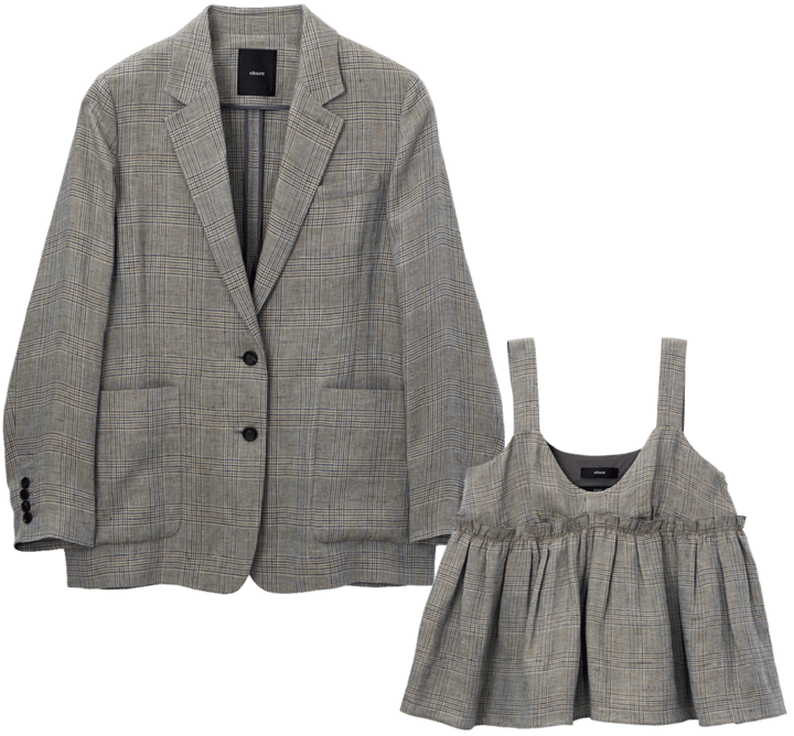 「ジャケットとキャミソール、同素材のセットアップが新鮮! 上質なリネン混のグレンチェック柄の素材は、あえてナイロン系のスポーティなアイテムを合わせて着たい」