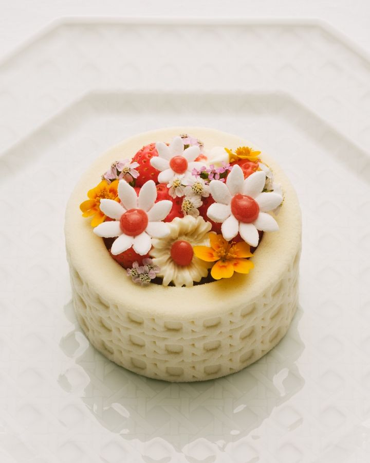 そしてもう一品は、〈Le Cannage Sucré / ル カナージュ シュクレ〉。イチゴとジンジャーのコンフィが添えられた、日本酒香るバニラ風味のアントルメで、ご覧のとおり華やかなビジュアル! チョコレートコーティングしたお米のシュトロイゼルの上にビスケット、その上に日本酒とみりんを使ったライスプディング、そしてイチゴと柚子のコンフィが流し込まれているという手の込んだスイーツ。一見、とても甘そうだけれど、良い意味で想像を裏切る、日本酒、みりん、酒かすなどが使われた大人好みの美味しさは感動もの。