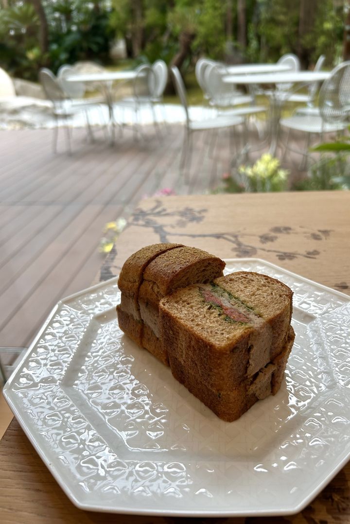 現在の限定メニューは3つ。〈Le Pain Couse-Main / ル パン クジュ マン〉は、ツナとバジル風味のそば茶のパン・バニャ。南仏で人気のスナックのひとつであるパン・パニャを再解釈したというサンドイッチは、旬の野菜、マリネしたツナ、パジルペーストが層をなした繊細で奥深い味わい。