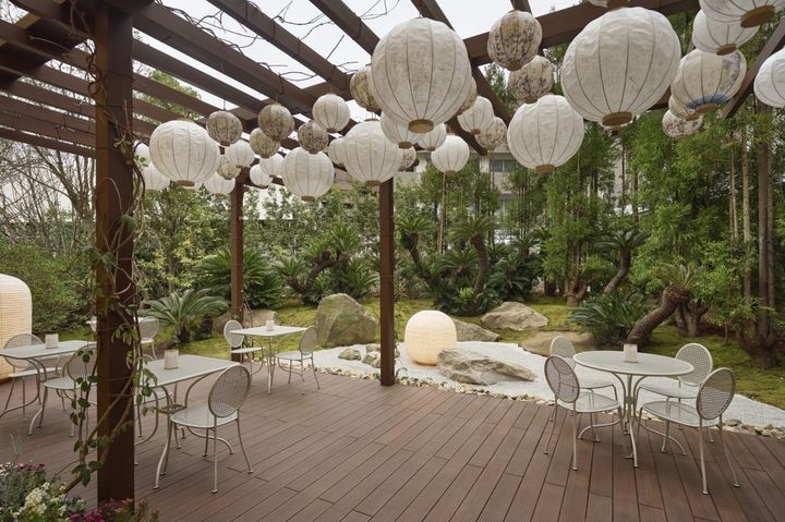 建物の周囲には禅をテーマに設計されたコンセプチュアルな庭園が広がり、まるでパワースポットを訪れたような静謐な空気に癒やされるはず。館内の壁には和紙が用いられ、京都の老舗が手がけた提灯のあしらいなど、光を柔らかく受け止める明るい演出に気分が上がる。日本人クリエイターやデザインスタジオによる現代アート作品が展示された、さながらミュージアムのような空間でのショッピングは、このパビリオンならではの大きな魅力。