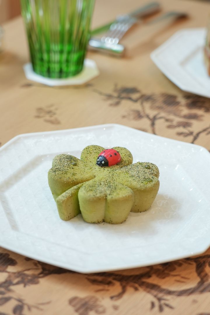 〈Le Tréfle / ル トレフル〉は、クローバーをモチーフにした抹茶とタラゴンのババロア。ピスタチオ風味のタルト生地に、抹茶、玄米茶とエストラゴン(タラゴンとも呼ばれるハーブ)のビスケットがオン。中に入った柚子のコンフィが爽やかで、ほろ苦い抹茶との相性も抜群。ちょこんと乗せられたてんとうむしのチョコレートは、新クリエイティブ ディレクターであるジョナサン・アンダーソンーへのオマージュ。