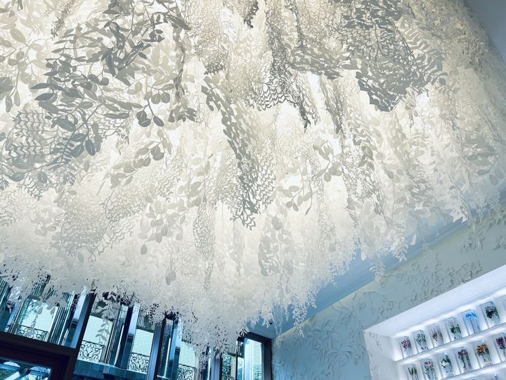 壁面は東信(あずままこと)氏によるフラワーアートに彩られ、天井からは柴田あゆみ氏のペーパーアート作品が光が降り注ぐかのようにデコレート。窓の外にはテラスとその先に庭園が広がり、目に入るものすべてがエレガントで贅沢。