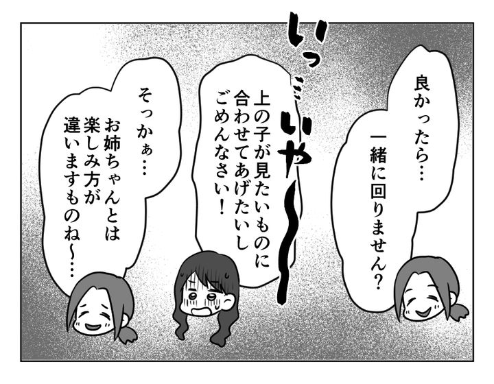 「一緒に回ろう」って……最初からそれが目的だったのでは……? と疑ってしまいます。いやいや、無理でしょ~……。ものすごく仲が良くて気を遣わなくていい関係性であれば一緒に回れるかもしれませんが、偶然を装ってぶっこんでくるようなご家庭と一緒になんて回れません! しかもこんな怖い人に、大切なリカちゃんを預けるなんてもっとできません! あまりの恐怖に、ナツキさんは猛スピードでその場を立ち去ったのでした。