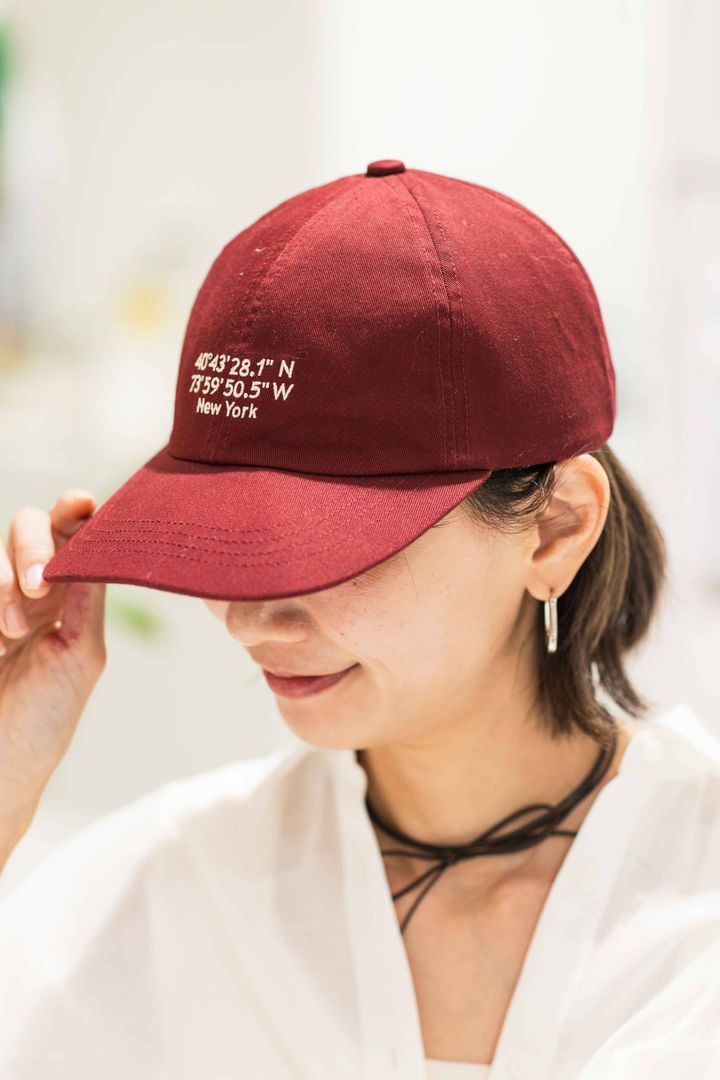 カジュアルなキャップはワインカラーをセレクトし上級者見え