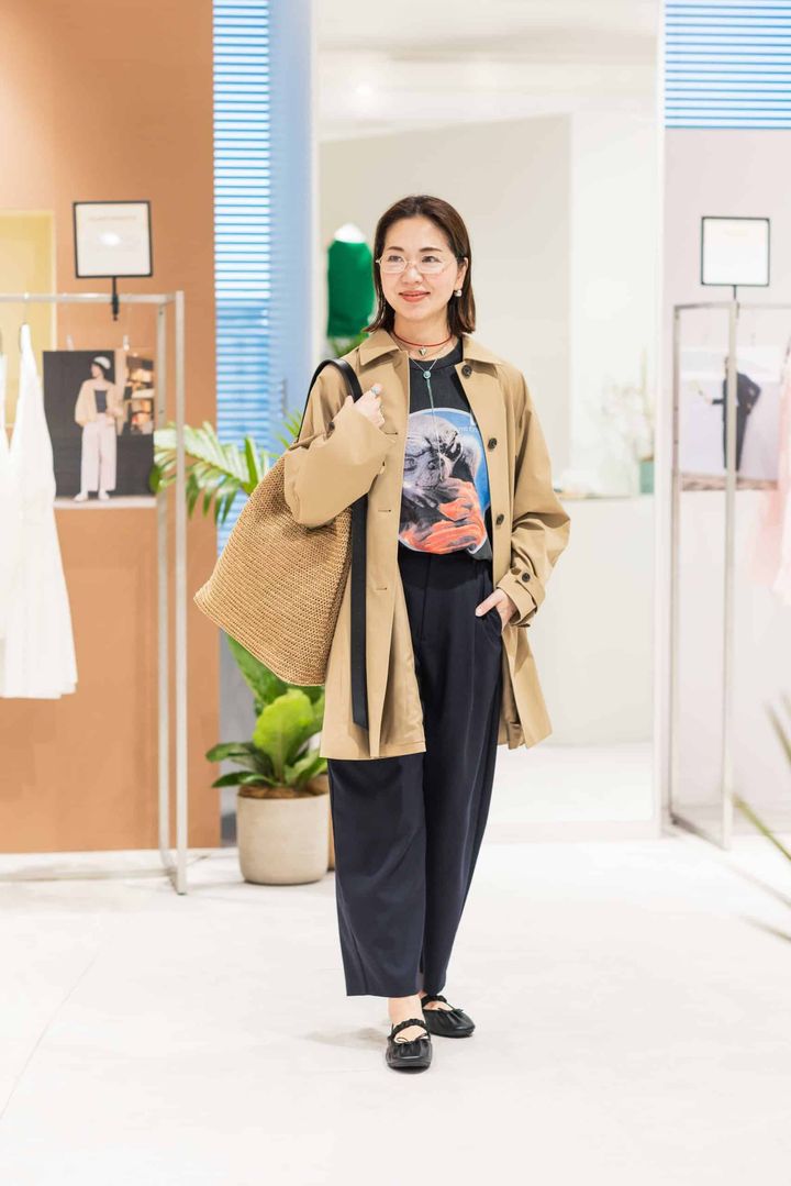「今年らしい味わいの定番バルマカーンコートは、ブラックコーデを春気分に近づけてくれます。注目のE・TプリントTシャツがマニッシュ感をプラスし、今どきの大人モードに。GUだから冒険できるモチーフアクセサリを重ねて、フレッシュ感を楽しみます。SNSでも話題になったバレエスニーカーが個性を光らせながら、上品なバッグと都会的メタルサングラスで大人コーデにまとめました」
