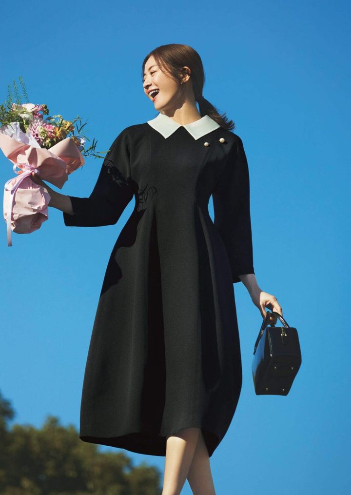 レディな華やかさとモードなキレ味を併せ持つ、大人のための黒ワンピ。ハイウエスト&計算されたチューリップラインで、ハレの日の高揚感もスタイルアップも欲張れる一枚です。取り外し可能な白衿で印象自在。セレモニー後は衿を外してデイリー仕様に。1回きりで終わらせない、着映えも着回しも叶える名品です。