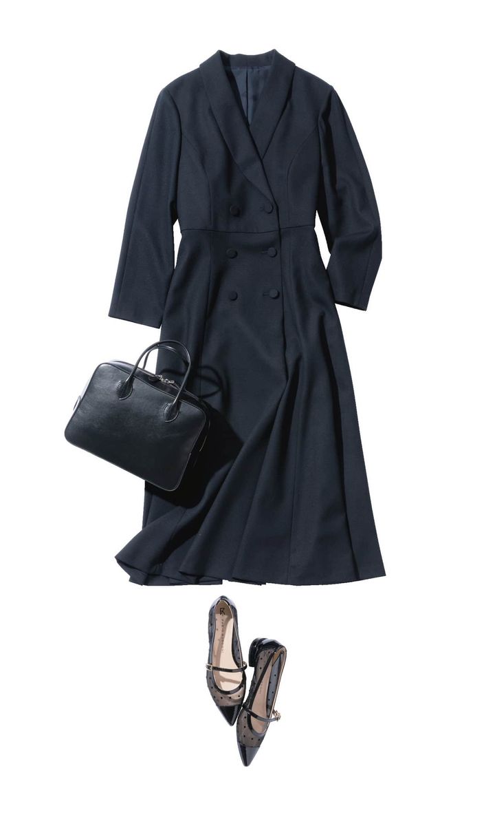 ダブルのくるみボタンとラペルが、きちんと感を一瞬で完成させるジャケ見えワンピ。コンサバな場でも浮かず、でも堅すぎない。だから迷わず手に取れる安心の正解です。セレモニー後は、小物を変えるだけで日常モードへスムーズにシフト。ハレもケもこれ一枚でつなぐ、無駄にしない賢い選択です。