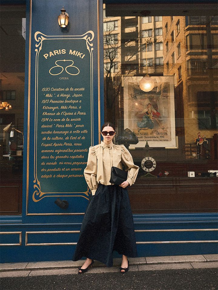【POINT】フレアスカートとレディな雰囲気に仕上げても、チノっぽい質感のおかげでガーリーに転ばない。クラシカルとモードな表情がまざったハイブリッド型は、トップス的な短め丈からが合わせやすい。