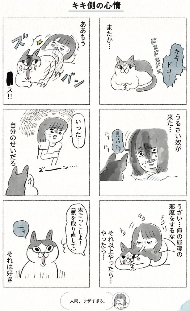本作は、著者・のなか海さんとちょっと激しめな性格で13歳になる実家猫・キキとの日常を描いたコミックエッセイ。愛想はよくないし、すぐキレる。塩対応ですれ違いもたくさんあるし、仲はたぶんよくない……。