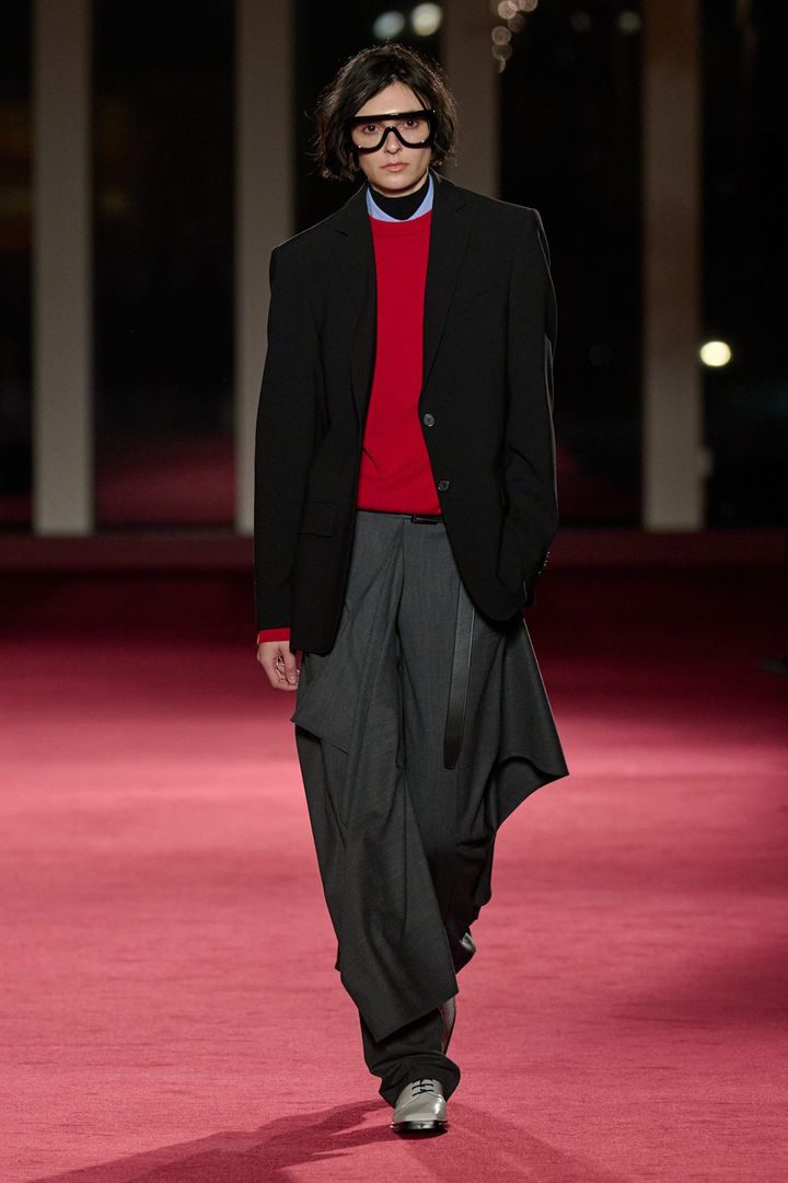序盤に登場した黒のテーラードジャケットに赤のニット、グレーのワイドトラウザーは、その方向性を端的に示した。肩は構築的だが過度に主張せず、トラウザーは腰からまっすぐに落ち、裾で静かに揺れる。ニュートラルカラーに鮮明な赤を一点差し込むことで、視線を奪う。
