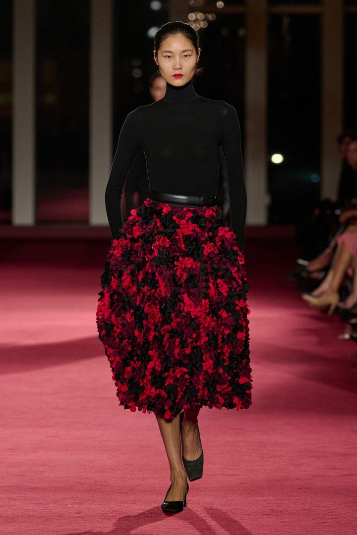 また、祝祭性を帯びたフェザー素材も、過剰には振れない。白シャツと組み合わせることで非日常でありながらも現実感を保った。黒のタートルネックに赤の3Dフローラルスカートを合わせたルックでは、トップをそぎ落とすことでボトムの造形を際立たせる。強さは装飾ではなく、計算されたシルエットから生まれている。