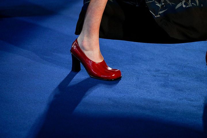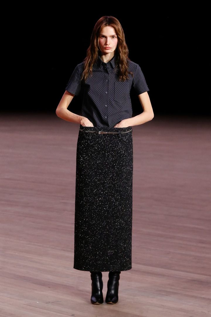 ファーストルックは赤のニットにパテントレザーのスカート。色と光沢は強いが、シルエットは静かだ。胸元のイワシモチーフのピンはバーチの遊び心であると同時に、彼女が育った東海岸のライフスタイルを想起させ、装いに軽さを加える。ラグジュアリーを過剰に主張しないバランス感覚がうかがえる。