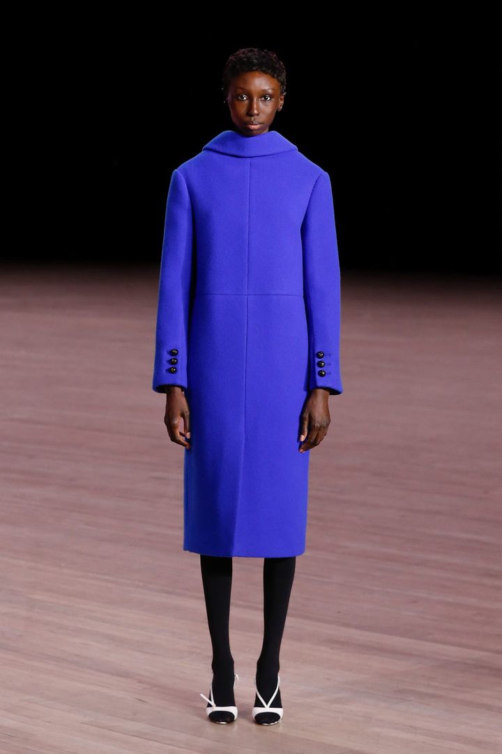 既視感を帯びながらも完全には思い出せないシルエットが並んだ。グレーのVネックニットとラメ入りのブラックペンシルスカートは都会的な雰囲気をまとい、ボルドーのスパンコールトップと硬質なブルーのミニスカートは高揚と静寂を交差させる。鮮烈なコバルトブルーの構築的なコートは端正でありながら、背面に配されたボタンによって前後の感覚を反転させる。