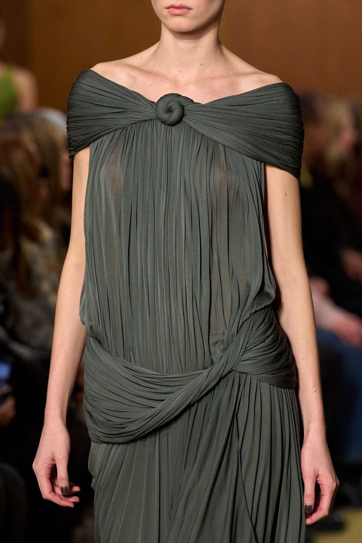コレクションを横断するモチーフは“ノット(結び目)”。園芸家でフィランソロピストのバニー・メロンのライフスタイルからヒントを得た“バニー・ノット”が、ドレスのドレープやジャージーのツイスト、バッグの金具へと展開された。バーチは2018年、カリブ海のアンティグアにあるメロンの邸宅を購入している。その自宅で目にしたキルティングクッションのディテールが、今回の“バニー・ノット”の発想へとつながった。個人的な経験が、具体的な造形として再解釈されている。