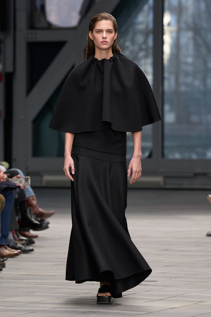 ハドソンヤードにあるザ・シェッドの会場に並んだレッドチェアの曲線と直線。その対比は、今季のテーマを既に暗示しているかのようだ。ブラックのケープドレスは、横に張り出すショルダーと床へ落ちる縦のラインで静かな存在感を放つ。アイボリーのロングドレスもまた、肩に水平に乗るケープとわずかに絞られたウエストから縦へ収束するシルエットが、身体の線を際立たせる。装飾をそぎ落とすことで、構造そのものが語り出す。縦長でストレートな構造は、ブランドの原点を思わせながらも、どこか軽やかだ。