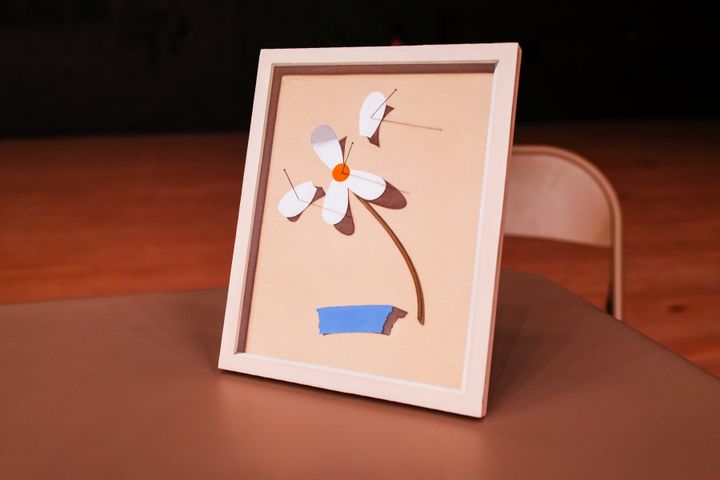 会場の片隅に置かれたデスクの上には、ペインターのアナ・ウェイアントによる小さな花の絵が置かれていた。それは完成された自然の描写ではない。切り抜かれた花弁がピンでとめられ、断片として固定されていた。昨年の展示『ザ・ドールハウス(The Dollhouse)』では、2024年コレクションのピースを纏ったペーパードールが並び、服そのものが縮尺のなかで小さく感じられる構造が提示された。それに対し今季は、ウェイアントの小さな絵画が空間の片隅に置かれ、逆に作品が縮小される。縮尺の主従が反転したことで、見る者の視点は静かに揺さぶられる。同じものでも、どこから切り取るかで物語は変わるのだ。