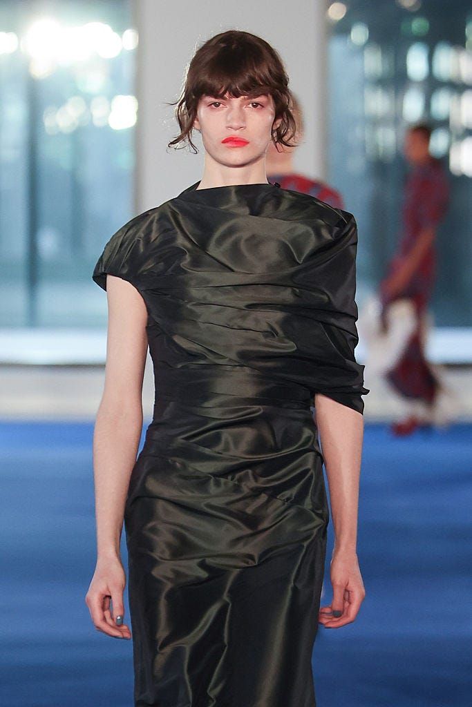 ショーの終盤、ペールピンクのドレープドレスが現れ、やがてタンジェリンのリキッドドレスが流れるように続いた。光を従えながらも構造はシンプルだ。そぎ落としを徹底したからこそ、この流動性が成立する。静から動へ、マットから光へ。計算し尽くされたような沈潜の積み重ねが、最後に高揚へと転じる。