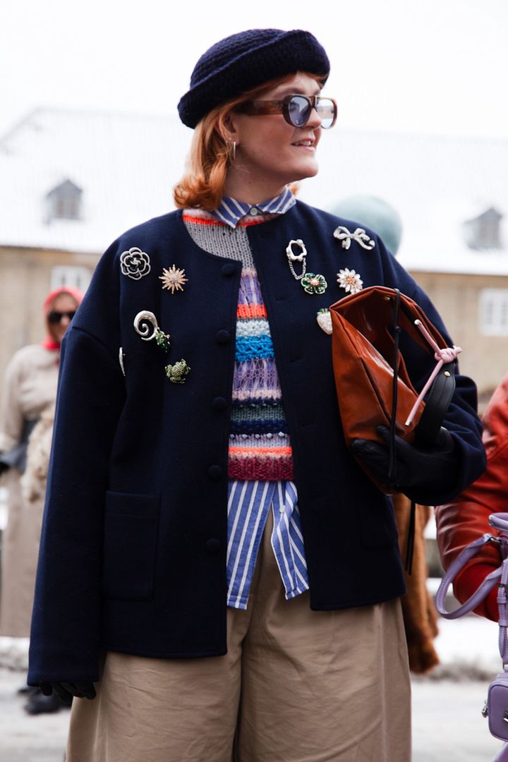 ネイビーのノーカラージャケットに、色とりどりのブローチを重ねづけ。ブローチの素材や雰囲気を揃えれば、「これでもか!」と散りばめても統一感をキープできる。